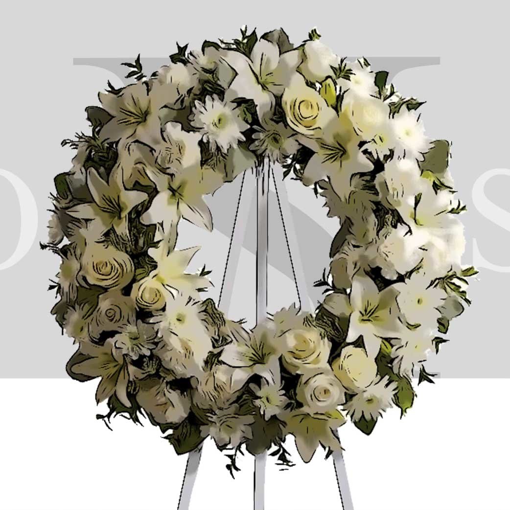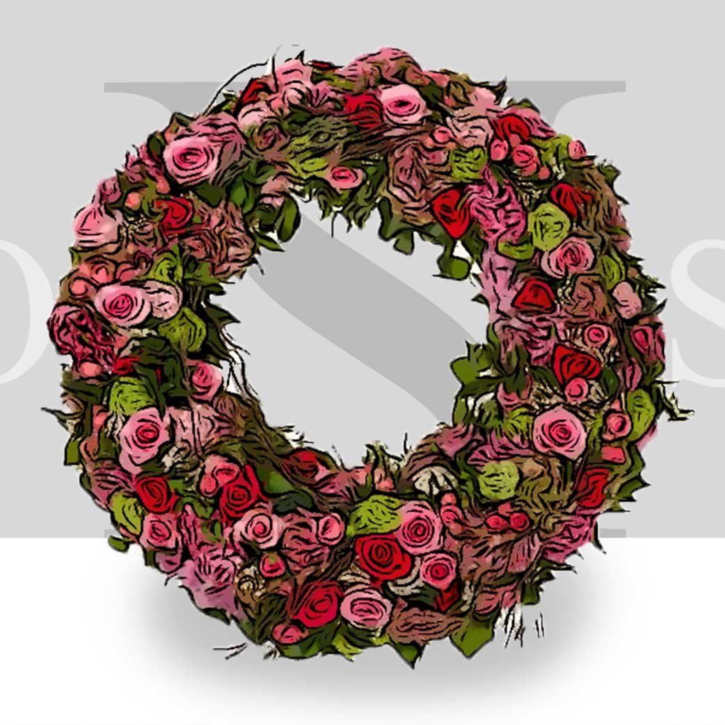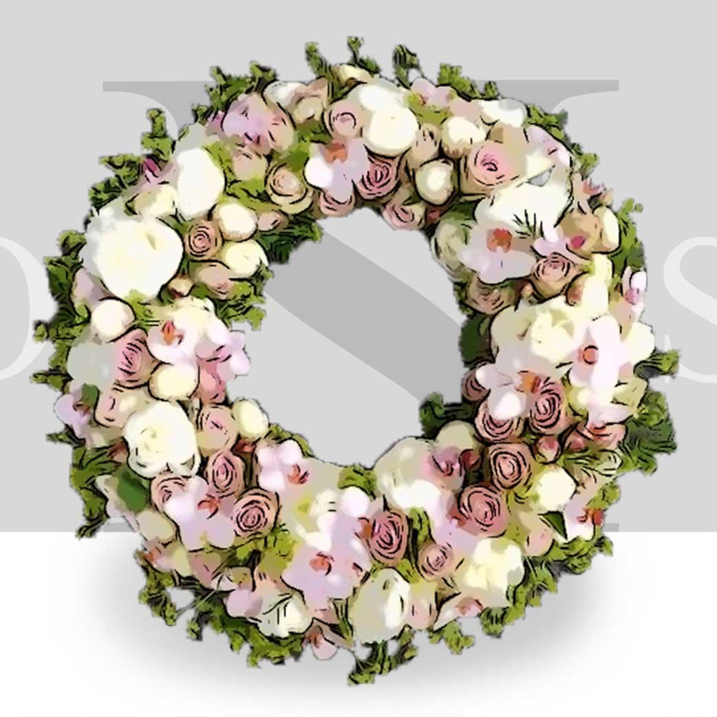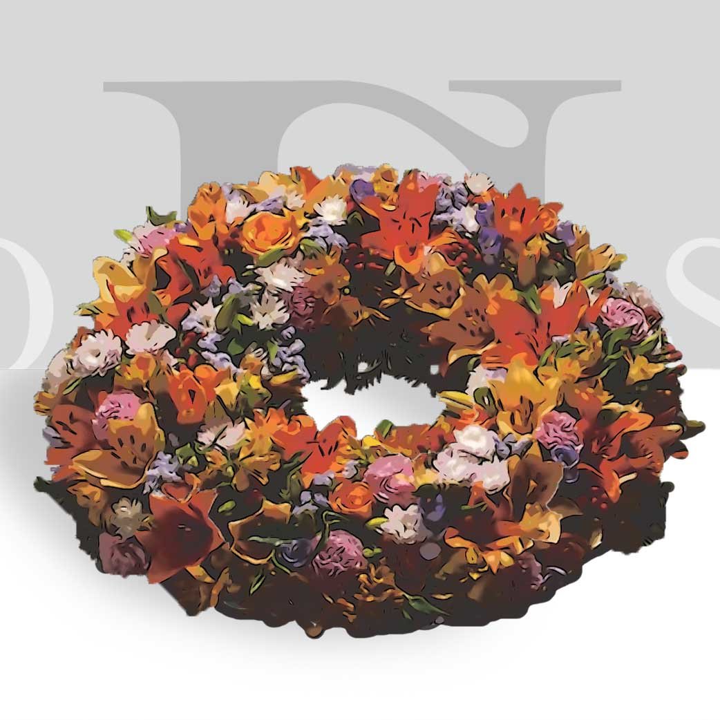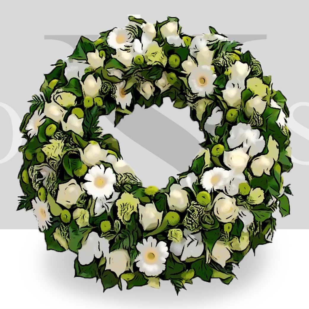Quoi de plus approprié pour un enterrement que cette couronne à poser réalisée à partir de fleurs de saisons dont vous pouvez bien sûr choisir les couleurs. Cette composition est disponible en deux tailles.