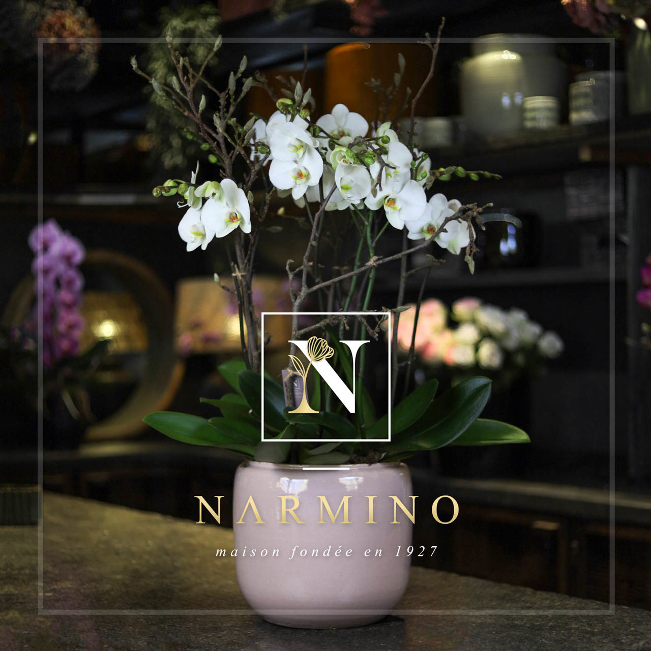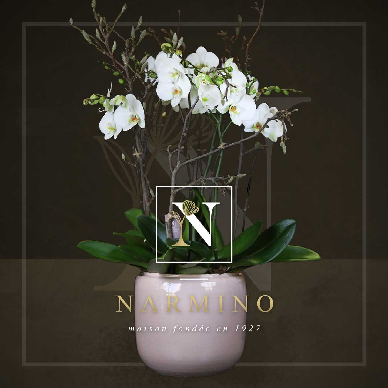 6 branches de Phalaenopsis, plus cache-pot et décoration.